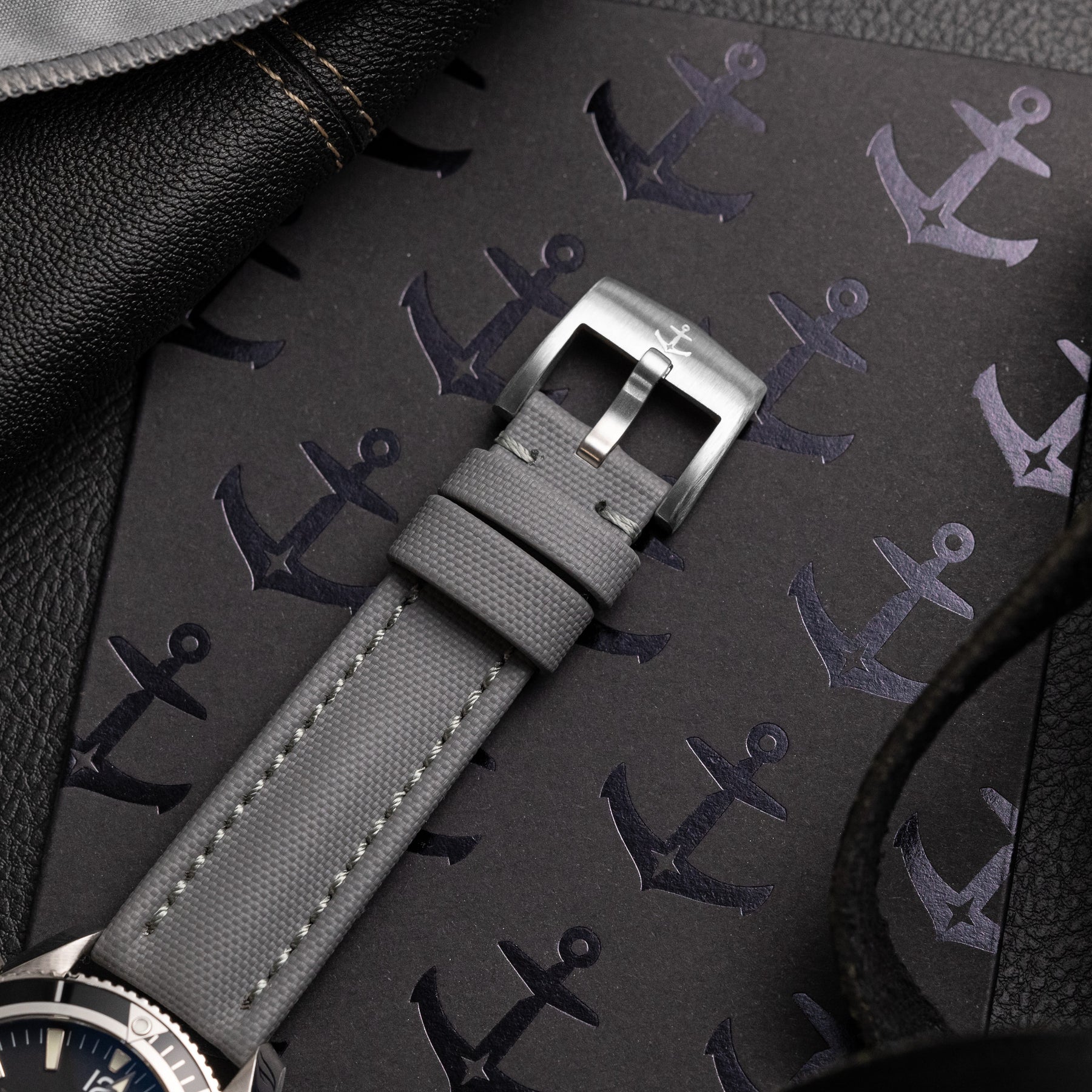 Constructed from durable marine-grade synthetic sailcloth and lined with supple caoutchouc rubber, this strap combines a tough exterior with an ultra-comfortable interior. The lightly textured finish offers a sophisticated look that pairs effortlessly with both modern and vintage tool watches.