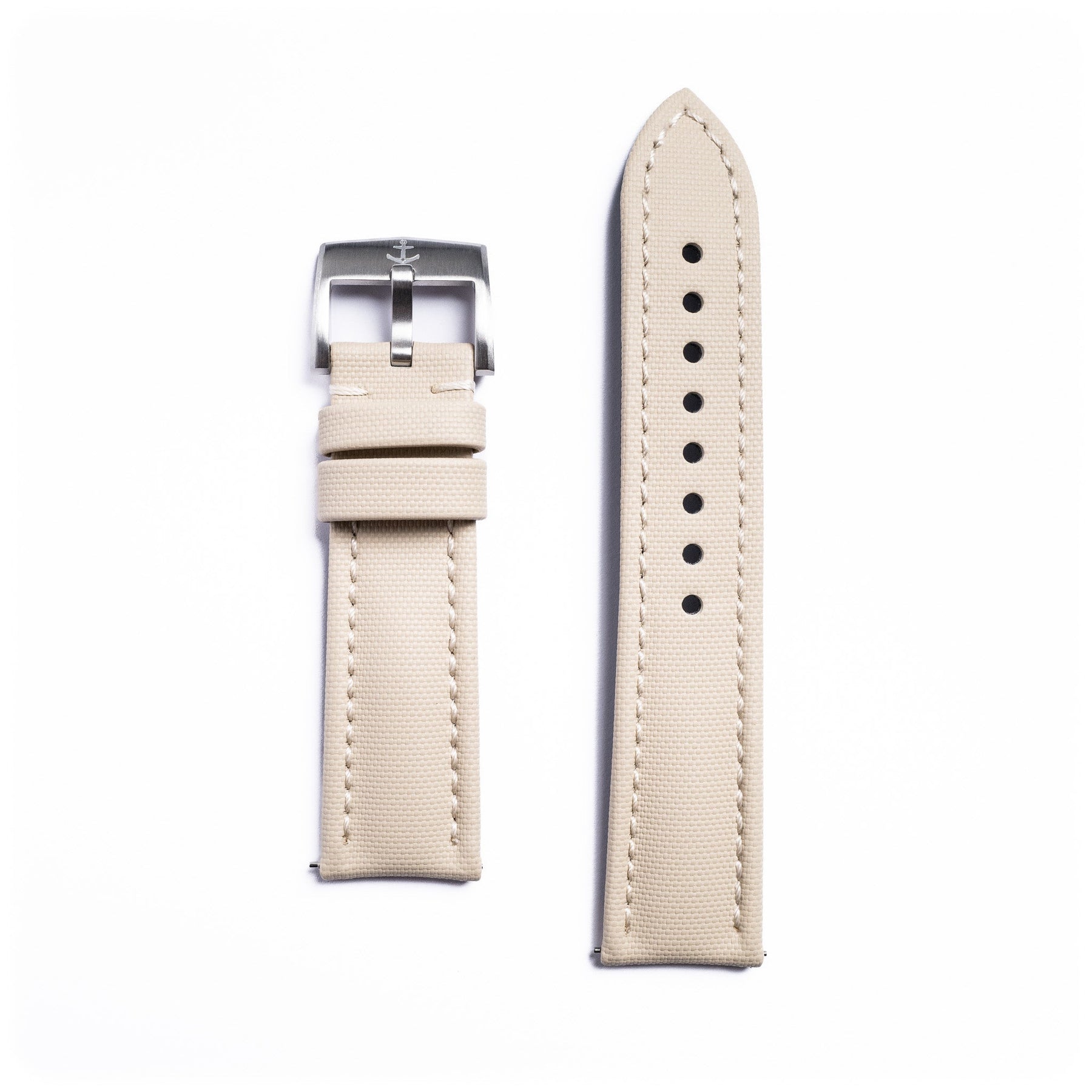 Constructed from durable marine-grade synthetic sailcloth and lined with supple caoutchouc rubber, this strap combines a tough exterior with an ultra-comfortable interior. The lightly textured finish offers a sophisticated look that pairs effortlessly with both modern and vintage tool watches.