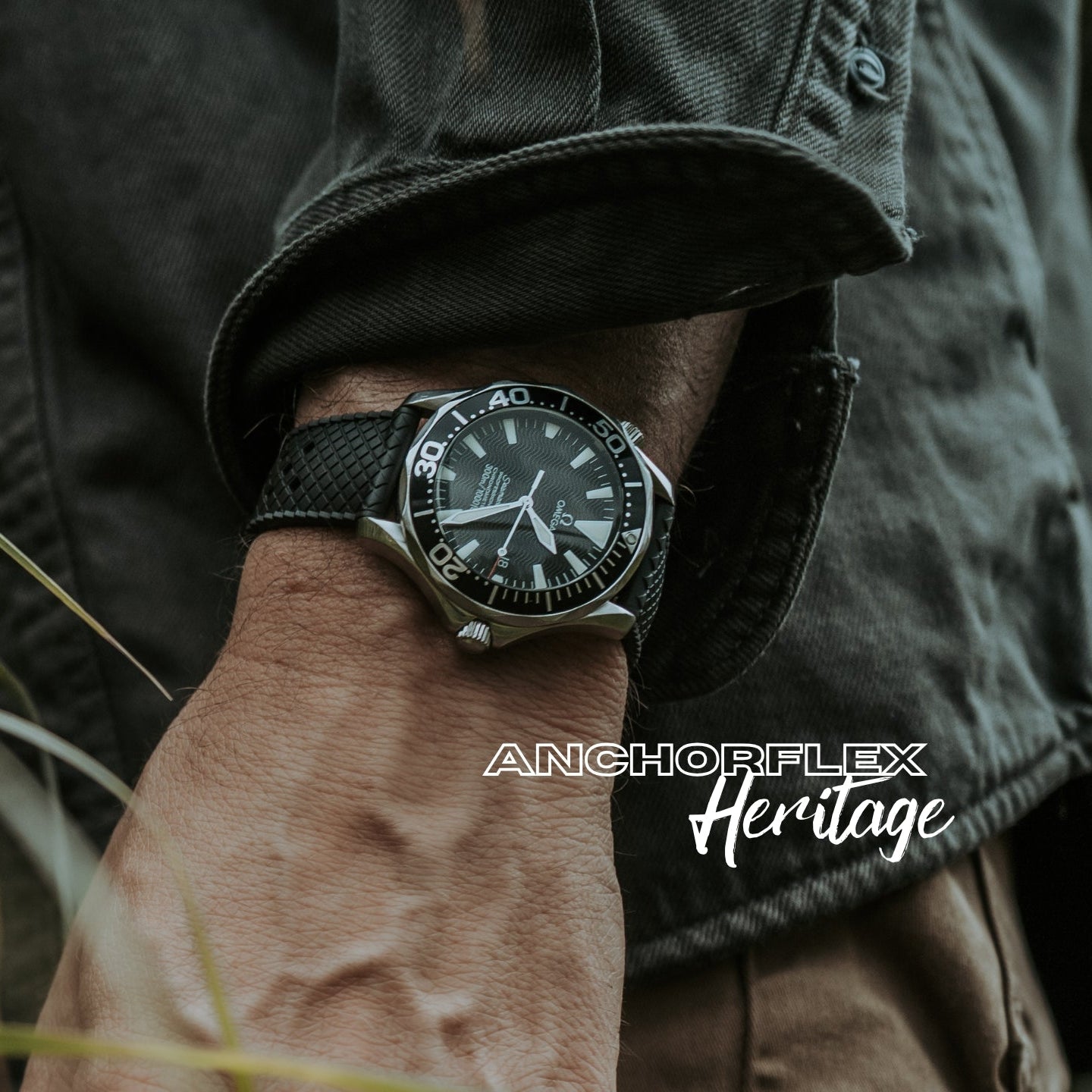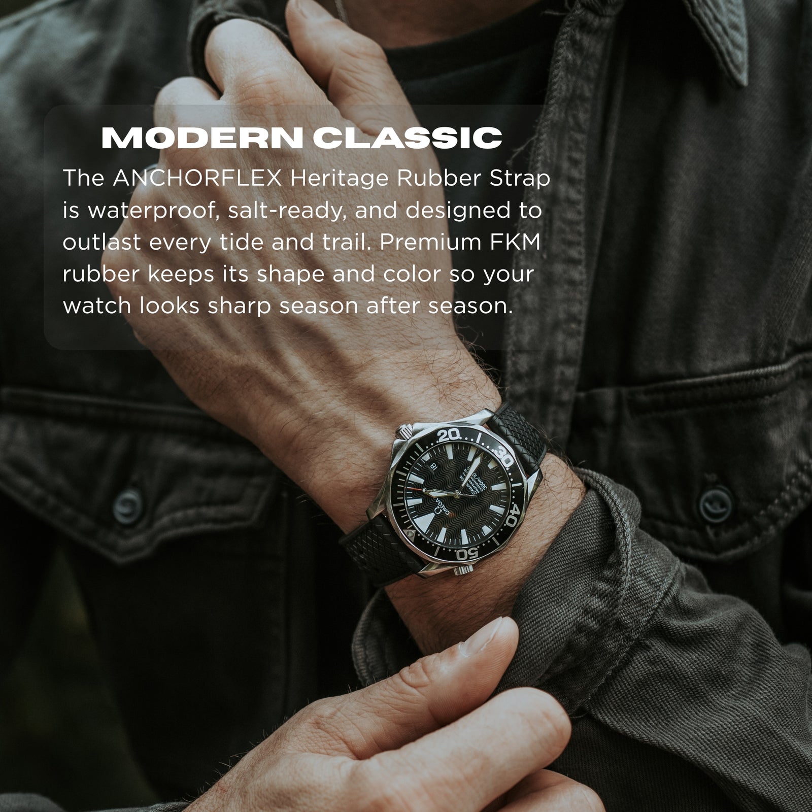 Inspired by the golden age of dive watches and reimagined for today, the AnchorFlex Heritage Strap blends vintage charm with cutting-edge material performance. Designed to complement your favorite tool watches—from classic Seikos to modern Tudors—it delivers timeless style with uncompromising durability.